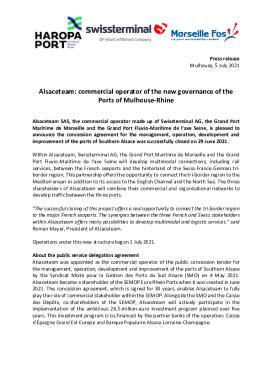 Alsaceteam SAS, the commercial operator made up of Swissterminal AG, the Grand Port Maritime de Marseille and the Grand Port Fluvio-Maritime de l'axe Seine, is pleased to announce the concession agreement for the management, operation, development and improvement of the ports of Southern Alsace was successfully closed on 29 June 2021.