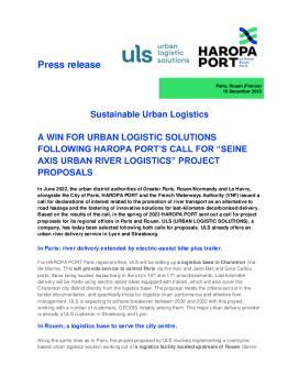 In June 2022, the urban district authorities of Greater Paris, Rouen/Normandy and Le Havre, alongside the City of Paris, HAROPA PORT and the French Waterways Authority (VNF) issued a call for declarations of interest related to the promotion of river transport as an alternative to road haulage and the fostering of innovative solutions for last-kilometre decarbonised delivery. Based on the results of the call, in the spring of 2023 HAROPA PORT sent out a call for project proposals for its regional offices in Paris and Rouen. ULS (URBAN LOGISTIC SOLUTIONS), a company, has today been selected following both calls for proposals. ULS already offers an urban river delivery service in Lyon and Strasbourg.