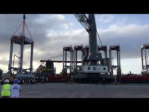 Arrivés de Finlande par la mer, les 12 cavaliers commandés par la GMP au groupe Kalmar ont été acheminés via le FW Sun – exploité par l’armement Schulte & Bruns. Chacun d’entre eux pèse 75 tonnes pour 16,5 m de hauteur.
