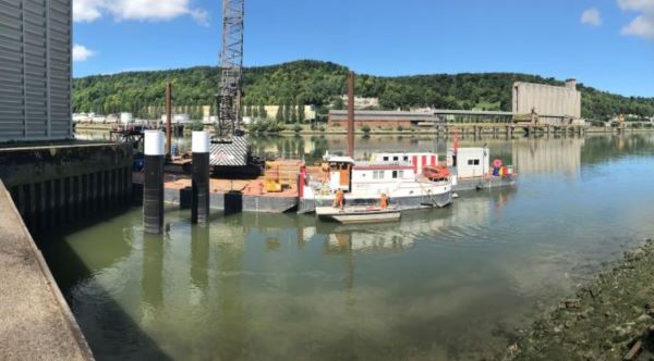 Les travaux, qui ont démarré le 7 juin 2021, consistent à sécuriser l’accostage sur le secteur amont exploité par le groupe BZ (Beuzelin) grâce à la construction d’un Duc d’Albe (pieux).