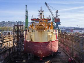 Depuis sa montée en cale sèche sur le dock flottant, le navire est hors d’eau et repose sur la ligne de tins dans le radier du dock. Cette période à sec est complexe et nécessite une attention toute particulière, notamment vis-à-vis des de la coactivité à bord de l’équipement de réparation navale. Les travaux se concentrent ici sous la ligne de flottaison.