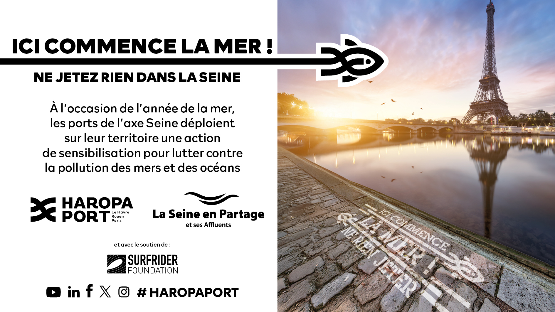 Pour sensibiliser les usagers à cette problématique environnementale, HAROPA PORT, en collaboration avec l'association La Seine en Partage et avec le soutien de l’ONG Surfrider Foundation Europe, lance une campagne intitulée « Ici commence la mer » : plaques et signalétiques seront installées sur le domaine portuaire et dans les territoires partenaires, à proximité des bassins, plaques d'égouts, quais et zones sensibles. Déployée lors de la semaine européenne du Développement durable, du 18 septembre au 8 octobre prochain, elle rappelle que chaque geste compte et qu'un déchet abandonné dans la rue peut finir par polluer la Seine, son estuaire, puis la mer.