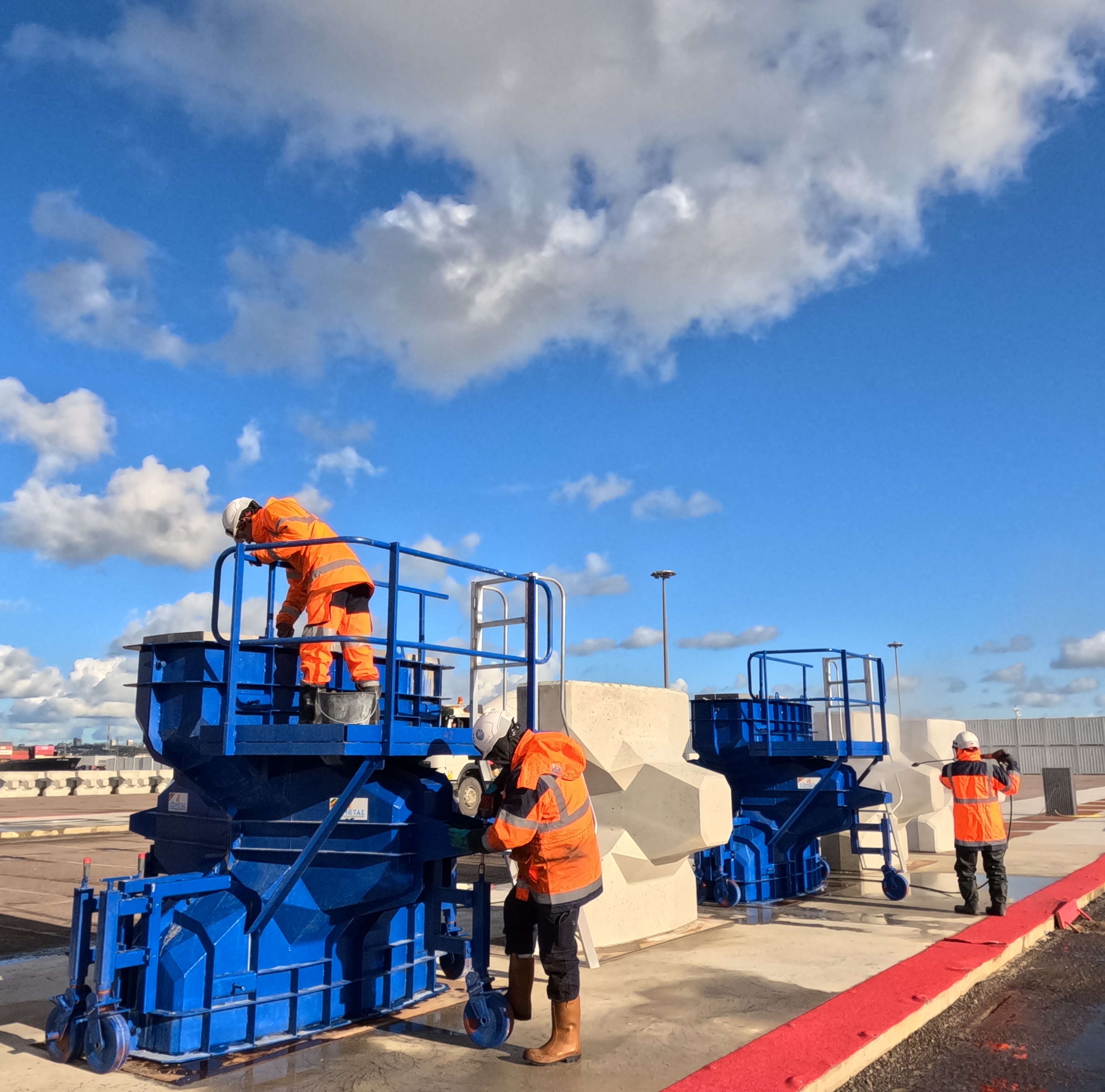 Le béton, fourni localement par la centrale Lafarge de Gonfreville, est coulé dans des moules préfabriqués puis décoffré après 24 heures. Chaque Accropode™ est ensuite contrôlé, puis stocké avant d’être acheminé à proximité du chantier. Leur installation sur la digue, assurée avec précision par des engins spécialisés, sera vérifiée grâce à un suivi GPS.