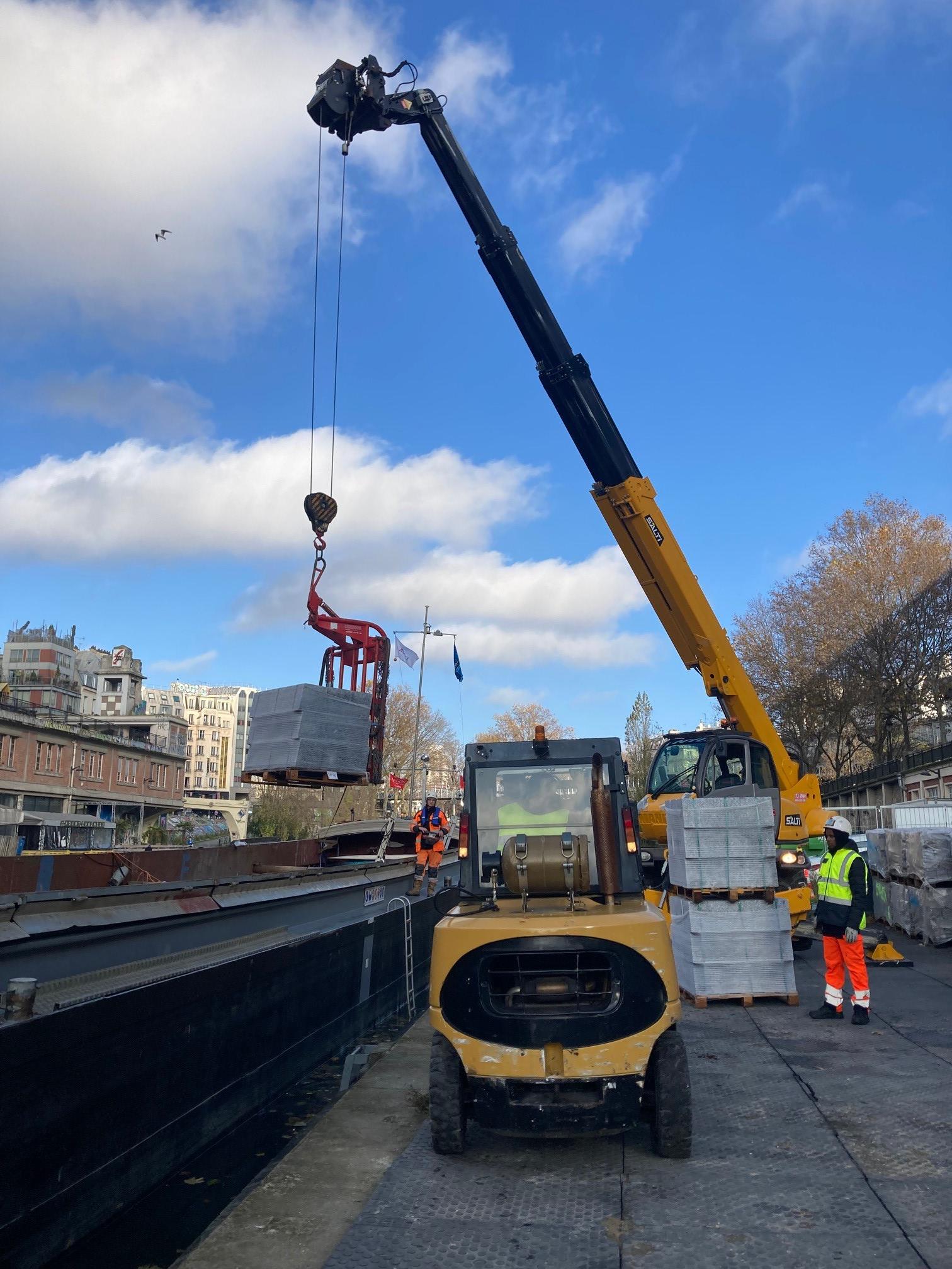 Chargés sur une barge depuis la plateforme multimodale de Bonneuil, les dalles et pavés de granite ont emprunté la Seine puis le Canal Saint Martin pour atteindre le quai de Jemmapes (10e arrondissement), avant de prendre la route pour le dernier kilomètre afin d’alimenter plusieurs chantiers :