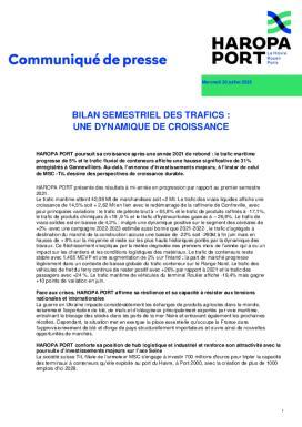HAROPA PORT poursuit sa croissance après une année 2021 de rebond : le trafic maritime progresse de 5% et le trafic fluvial de conteneurs affiche une hausse significative de 31% enregistrés à Gennevilliers. Au-delà, l’annonce d’investissements majeurs, à l’instar de celui de MSC -TiL dessine des perspectives de croissance durable.