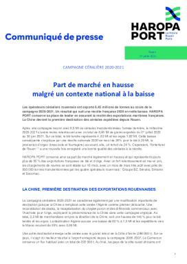 Les opérateurs céréaliers rouennais ont exporté 6,45 millions de tonnes au cours de la campagne 2020-2021. Un résultat qui suit une récolte française 2020 en nette baisse. HAROPA PORT conserve sa place de leader en assurant la moitié des exportations maritimes françaises. La Chine devient la première destination des céréales expédiées depuis Rouen.