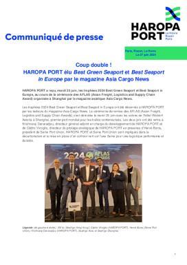 HAROPA PORT a reçu, mardi 25 juin, les trophées 2024 Best Green Seaport et Best Seaport in Europe, au cours de la cérémonie des AFLAS (Asian Freight, Logistics and Supply Chain Award) organisée à Shanghai par le magazine asiatique Asia Cargo News.