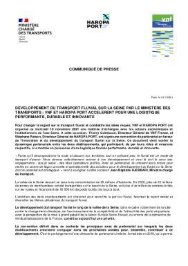 Pour changer le regard sur le transport fluvial et combattre les idées reçues, VNF et HAROPA PORT ont organisé ce mercredi 10 novembre 2021 une matinée d’échanges avec les acteurs économiques et institutionnels de l’axe Seine. A cette occasion, Thierry Guimbaud, Directeur Général de VNF France, et Stéphane Raison, Directeur Général de HAROPA PORT, ont signé une convention de partenariat en faveur de l’innovation et du développement du transport fluvial sur la Seine.