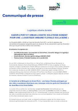 CP - HAROPA PORT et Urban Logistic Solutions signent pour une « logistique urbaine fluviale via la Seine »