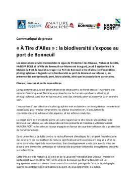 « À Tire d'Ailes » : la biodiversité s’expose au port de Bonneuil Les associations environnementales la Ligue de Protection des Oiseaux, Nature & Société, HAROPA PORT et la Ville de Bonneuil-sur-Marne ont inauguré, jeudi 8 septembre à la Maison du Port, le nouvel ouvrage « Le Port de Bonneuil à tire d’ailes » et l’exposition photographique « Regards sur la biodiversité au port de Bonneuil-sur-Marne », en présence des entreprises du port, leurs salariés, ainsi que les associations partenaires.