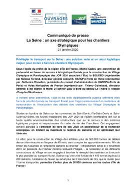 Sous l’égide du préfet de la région d’Île-de-France, Michel Cadot, une convention de partenariat associant l’État, la SOLIDEO, HAROPA PORT et Voies Navigables de France a été signée le mardi 21 janvier 2020. Objectif : affirmer avec force la priorité donnée au transport fluvial pour l’approvisionnement en matériaux de construction et l’évacuation des déblais des chantiers du Village des JOP 2024.