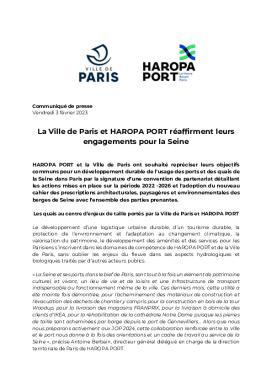 HAROPA PORT et la Ville de Paris ont souhaité repréciser leurs objectifs communs pour un développement durable de l’usage des ports et des quais de la Seine dans Paris par la signature d’une convention de partenariat détaillant les actions mises en place sur la période 2022 - 2026 et l’adoption du nouveau cahier des prescriptions architecturales, paysagères et environnementales des berges de Seine avec l’ensemble des parties prenantes.