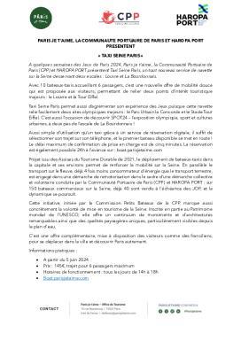 A quelques semaines des Jeux de Paris 2024, Paris je t’aime, la Communauté Portuaire de Paris (CPP) et HAROPA PORT présentent Taxi Seine Paris, un tout nouveau service de navette sur la Seine desservant deux escales : Louvre et La Bourdonnais.