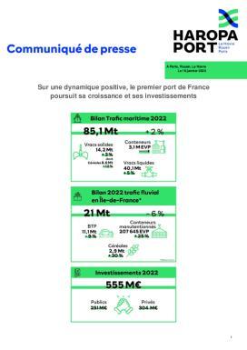 Dans un contexte international marqué par de multiples crises, HAROPA PORT progresse dans un marché en baisse et fait preuve d’une résilience notable en gagnant des parts de marché sur le range nord et en améliorant ses parts modales sur l’axe Seine. L’établissement, qui a engagé sa transformation lors de sa fusion en 2021, observe ainsi des premiers résultats notablement positifs avec la décision historique de MSC d’investir pour renforcer le corridor logistique séquanien. En 2023, le 1ᵉ port français entend poursuivre ses investissements et sa transformation, en développant le premier écosystème industriel décarboné et en poursuivant la structuration de son corridor logistique multimodal.