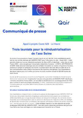 Au terme d’un appel à projets lancé en juin dernier, trois candidatures ont été retenues par HAROPA PORT pour l’affectation du site « Ouest A29 ». Cette parcelle située sur la zone industrialo-portuaire du Havre (ZIP) et labellisée « sites clés en main France 2030 », sera occupée par trois projets industriels d’ampleur : LIVISTA, AIR PRODUCTS et QAIR.