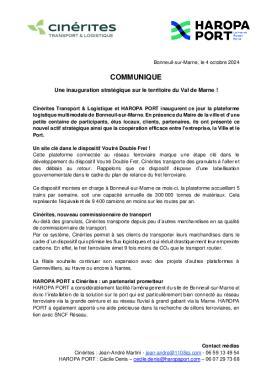 Cinérites Transport & Logistique et HAROPA PORT inaugurent ce jour la plateforme logistique multimodale de Bonneuil-sur-Marne. En présence du Maire de la ville et d’une petite centaine de participants, élus locaux, clients, partenaires, ils ont présenté ce nouvel actif stratégique ainsi que la coopération efficace entre l’entreprise, la Ville et le Port.