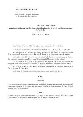 Décisions règlementaires : Arrêté ministériel du 19 août 2024 portant nomination par intérim du président du directoire du grand port fluvio-maritime de l'axe Seine