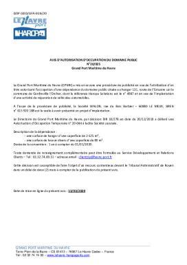 Le Grand Port Maritime du Havre (GPMH) a mis en oeuvre une procédure de publicité en vue de lattribution dun titre autorisant loccupation dune dépendance du domaine public située au hangar 131, route de lEstuaire sur la commune de Gonfreville lOrcher, dont la référence Haropa Solutions est le n° 4987 et en vue de limplantation dune activité de réparation de véhicules automobiles.