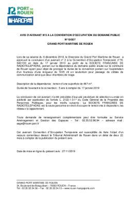 AVIS DAVENANT N°2 A LA CONVENTION DOCCUPATION DU DOMAINE PUBLIC - N°19/007 - GRAND PORT MARITIME DE ROUEN