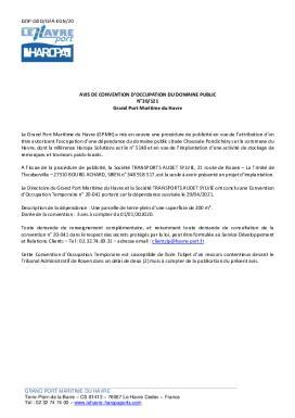 Le Grand Port Maritime du Havre (GPMH) a mis en oeuvre une procédure de publicité en vue de lattribution dun titre autorisant loccupation dune dépendance du domaine public située Chaussée Pondichéry sur la commune du Havre, dont la référence Haropa Solutions est le n° 5148 et en vue de limplantation dune activité de stockage de remorques et tracteurs poids-lourds.
