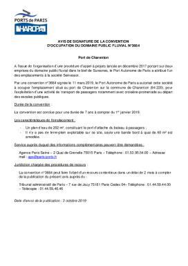 Avis de signature de la convention doccupation du domaine public fluvial n°3664 - Port de Charenton