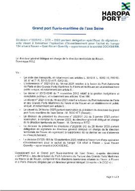 Décision n°2025-10 DTR DGD portant délégation spécifique de signature - acte visant à formaliser l'opération d'investissement pour l'achat du hangar 134 situé Rouen - Quai Rouen Quevilly - appartenant à la société DOCKSEINE.