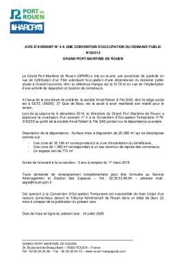 N°20/012 - Avis de convention doccupation du domaine public - GRAND PORT MARITIME DE ROUEN - Avis avenant n°4