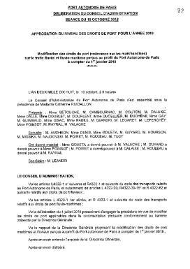 Port autonome de Paris - Délibération du CA du 10 octobre 2018 - Approbation du niveau des droits de port pour l'année 2019