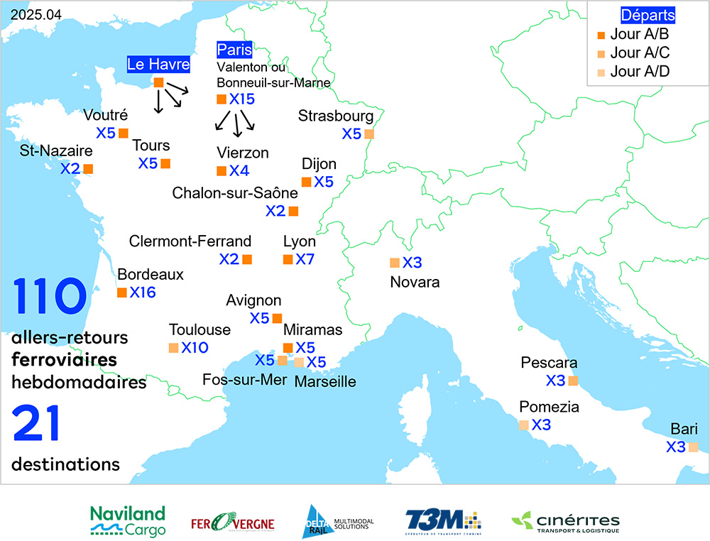 des liaisons directes depuis les plateformes du Havre et de Paris (Bonneuil-sur-Marne) à destination des principales zones de chalandises françaises et vers l’Europe ;